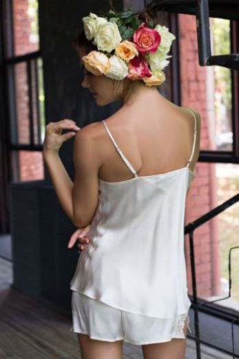 Комплект топ и шорты из натурального шелка. Топ с V-образным вырезом горловины полочки отланы кружевом. Топ на тонких регулируемых бретелях с вытачкой в пройме. Шорты на широком поясе-резинке, вставки по бокам с разрезами декорированы кружевом.