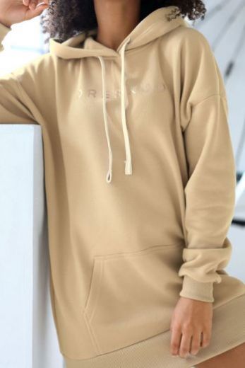 Бежевое платье-худи oversize DK24 06 с капюшоном, выполнено из плотной ткани с начесом. Спереди накладной карман и голографический логотип. Рукава и нижняя кромка отделаны трикотажной резинкой.