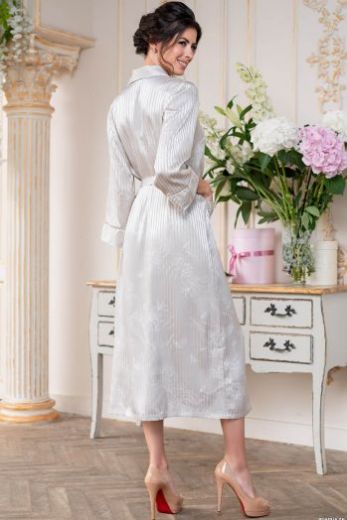 Длинный халат Josephine с центральной застежкой на пуговицы выполнен из искусственного принтованного жаккардового полотна. Перед халата декорирован парой кармашков на уровне бедер. Воротник, рукава и карман декорированы тонким кантом. По талии ширина халата регулируется поясом.