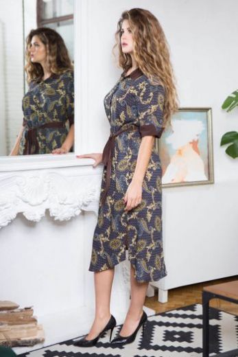 Халат домашний женский выполнен из принтованной вискозы. Модель на поясе свободного силуэта средней длины. Халат рубашечного типа с воротником стойкой и планкой застежкой на пуговицах. Рукав прямой длиной до локтя. В боковых швах изделия карманы.