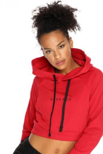 Красное укороченное худи DK04 07 с капюшоном. Рукава и нижняя кромка отделаны трикотажной резинкой, на груди фирменный логотип.