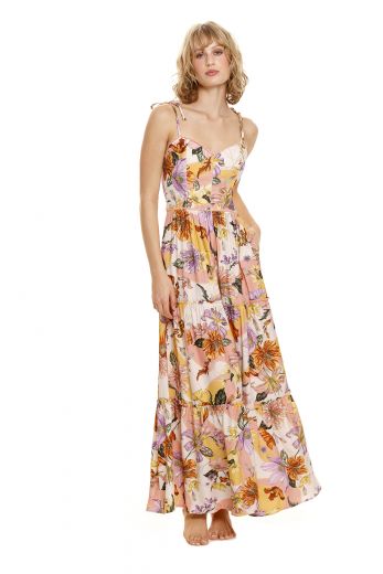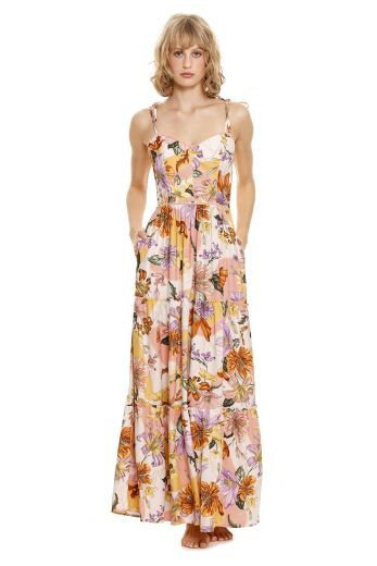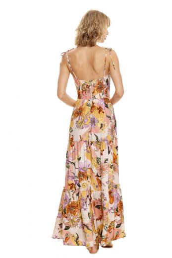 Длинное платье Suzie с контрастным цветочным принтом на тонких бретелях с завязками. Идеальный образ для пляжа и улицы.