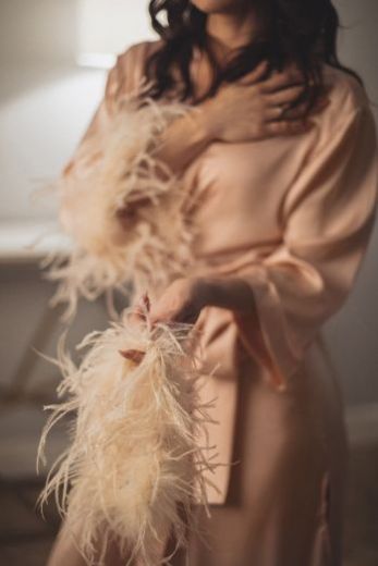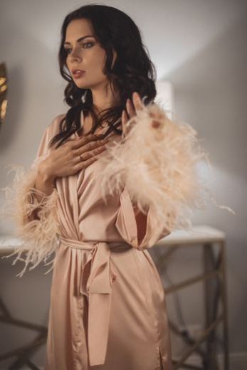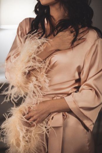 Самый эффектный и популярный халат-накидка с боа, вызывающий бурю эмоций и интереса к твоему образу. Халат-накидка из персикового армани шелка, струящегося по твоему телу, создающего эффект второй кожи, абсолютно комфортного и уютного, но при этом оставляющего за собой сексуальность и элегантность. Халат-накидка станет идеальным образом для домашнего использования, а также, сняв боа, которые легко отстегиваются, накинув его поверх мини-платья, шикарной накидкой для выхода в свет.