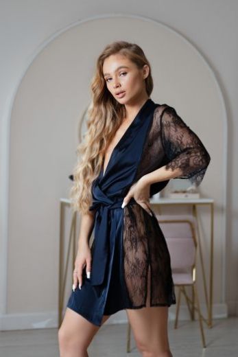 Невероятно сексуальный халат из темно-синего армани шелка, струящегося по твоему телу и подчеркивающего все его достоинства, с кружевными вставками по бокам, привлекающими все внимание мужчины только к тебе! А поясом от халата ты можешь связать руки твоему любимому или завязать глаза.