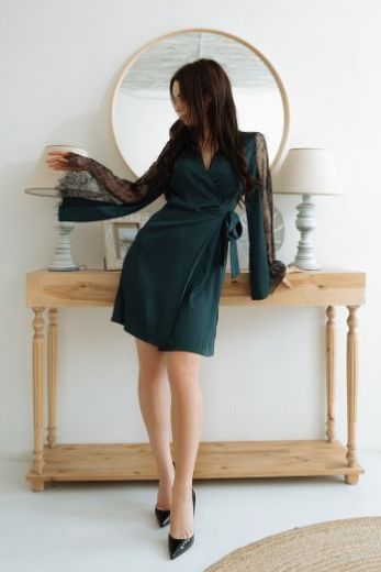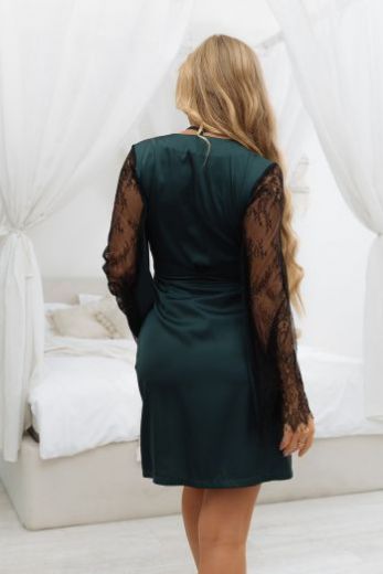Элегантный, пленительный и сексуальный халат на запахе из темно-зеленого армани шелка с кружевными рукавами, подчеркивающими красоту твоих рук и привлекающими все внимание к тебе. Халат подчеркивает каждый изгиб, струясь по твоему телу. Он станет идеальным образом для дома, а также платьем на свидание, дополнив его туфлями на шпильке. Почувствуй себя королевой этого вечера!