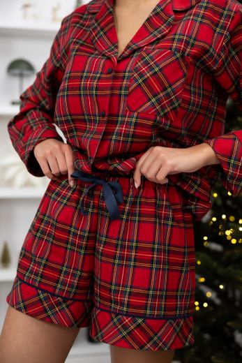 Интересный комплект Cynthia красного цвета, в "клетку" состоит из рубашки на пуговицах и широких шорт. Рубашка и шортики оформлены манжетами с контрастным кантом. Идеальный вариант для отдыха в домашней обстановке.