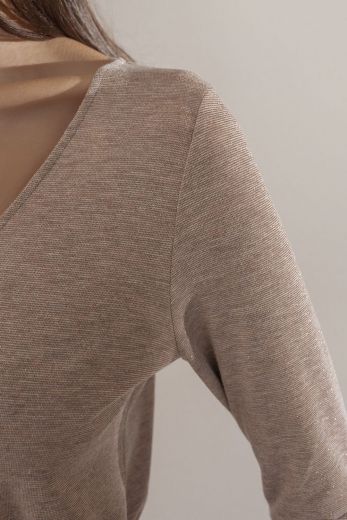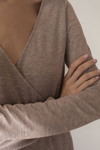 Модель платья на запах бронзового цвета с блестящими нитями люрекса. Модель длины миди, с тонким элегантным поясом, позволяющим регулировать посадку и подчеркивать силуэт по желанию. Элегантная модель, благодаря своему универсальному цвету и интересному фасону не только выгодно подчёркивает фигуру, но и позволяют свободно двигаться, а так же поможет создать привлекательный образ в сочетании с другими вещами вашего гардероба.