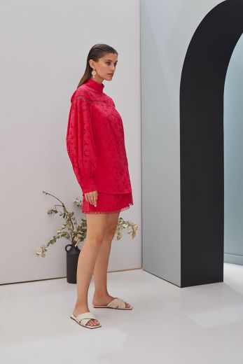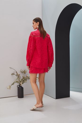 Рубаш?а с длинным ру?авом яр?ого малинового оттен?а. Рубаш?а выполнена из ?ружевной лег?ой т?ани, т?ань достаточно плотная, но приятная ? телу и не стесняет в движениях, позволяя даже в самый жар?ий день чувствовать себя ?омфортно в любой ситуации. Втачные ру?ава- фонари?и рубаш?и выполнены с де?оративными сбор?ами у манжетов. Рубаш?а застегивается на стильные пуговицы. Чуть выше груди модель у?рашена горизонтальными де?оративными вырезами, усложняющими и у?рашающими модель и делая свою обладательницу заметнее и элегантнее.