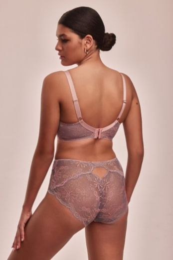 Кружевные трусики-слип Madera с завышенной посадкой и широким бочком. Выполнены из роскошного сиреневого кружева с цветочным узором. Ластовица хлопковая.
