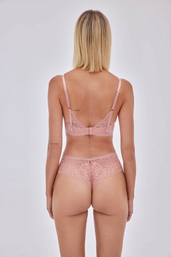 Высокие кружевные трусики-стринги Nude Rose розового цвета. Ластовица хлопковая.
