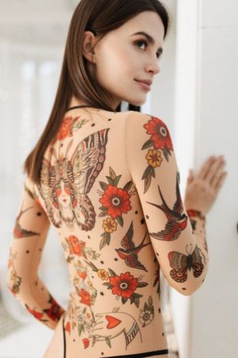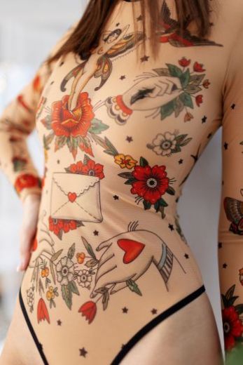 Один из самых удобных и универсальных предметов женской одежды - боди. Дерзко, но в то же время женственно и невинно смотрятся тату - принты на полупрозрачных тканях, каждая из которых отражает настроение, несет тайный смысл и женскую силу. Боди с подобным декором отлично впишутся как в сдержанные casual - look, так и в эффектные вечерние ансамбли. Носят его поверх телесного, черного или коричневого бесшовного бюстгальтера. Но особо смелые - на свое прекрасное тело без лишних деталей. Наша модель органично сочетается как с однотонными минималистичными вещами, так и с более яркой, сложной, интересной одеждой. Используй боди как базу под брючные костюмы, кардиганы, рубашки, сарафаны и платья без рукавов.