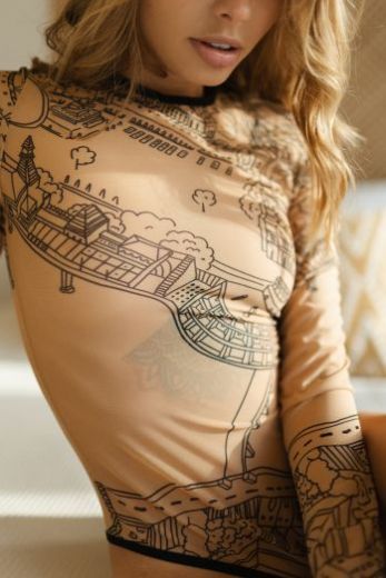 Удобная и универсальная блузка-боди со стрингами. Дерзко, но в то же время женственно и невинно смотрятся тату - принты на полупрозрачных тканях, каждая из которых отражает настроение, несет тайный смысл и женскую силу. Боди с подобным декором отлично впишутся как в сдержанные casual-look, так и в эффектные вечерние ансамбли. Носят его поверх телесного, черного или коричневого бесшовного бюстгальтера. Наша модель органично сочетается как с однотонными минималистичными вещами, так и с более яркой, сложной, интересной одеждой. Используй боди как базу под брючные костюмы, кардиганы, рубашки, сарафаны и платья без рукавов.