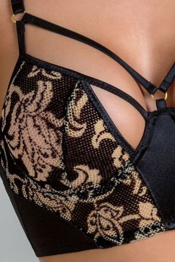 Комплект Victoria выполнен из качественного материала, которое идеально садится по фигуре. Черный атлас покрыт оригинальным золотым узором. Бюстгальтер на косточках мягко приподнимает грудь. Их округлость дополнительно подчеркивается полосами, которые являются дополнительным элементом, украшающим вырез. Трусы привлекают внимание тем же рисунком, что и на бюстгальтере.
