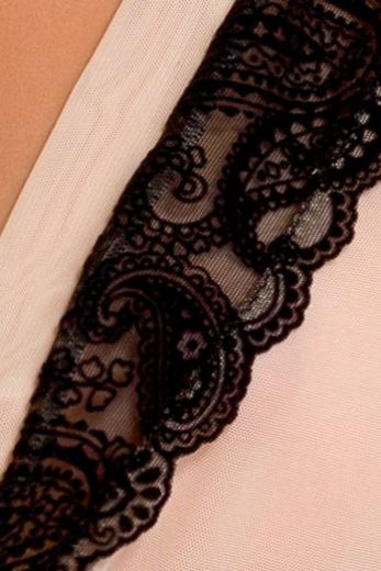 Красивый воздушный пеньюар бежевого цвета с черными кружевными вставками. Полупрозрачный, нежный и приятный к коже тюль обволакивает тело, оставляя ему свободу движений. Завязка на талии обеспечивает удобную посадку халата по фигуре. Пеньюар упакован в красивую плотную коробку.