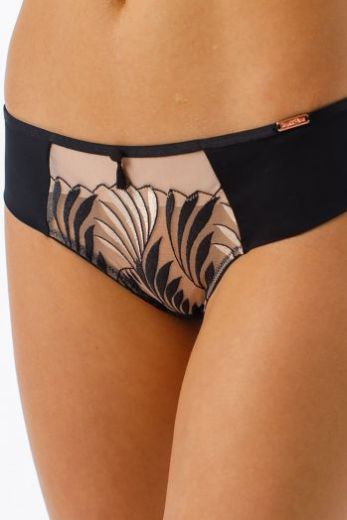 Трусы-панти со средней линией талии. Выполнены из неэластичной сетки с вышивкой на передней части, эластичной сетки и эластичного полотна. Украшение: декоративная кисточка и металлический логотип COQUETTE REVUE.