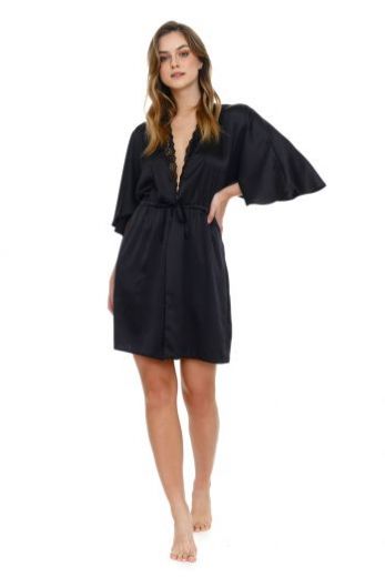 Сатиновый халат SWW.5102 Black с широки рукавами длиной 3/4. По талии регулируется кулисой с завязками. Халат декорирован кружевом.