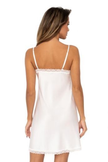 Сатиновая сорочка Tiffani цвета экрю на тонких регулируемых бретелях. Вырез и подол сорочки декорирован ажурным кружевом в тон. Сорочка упакована в красивую плотную коробку.