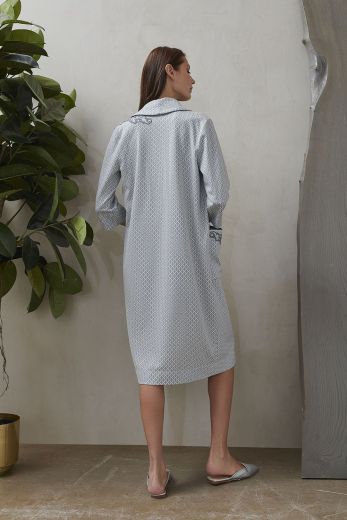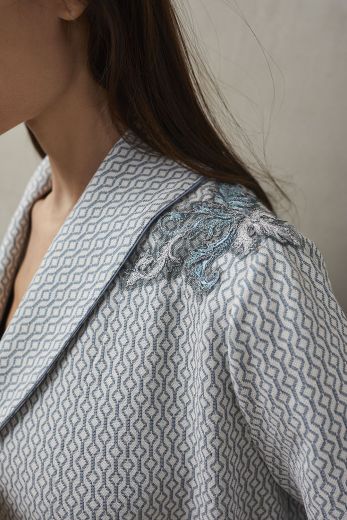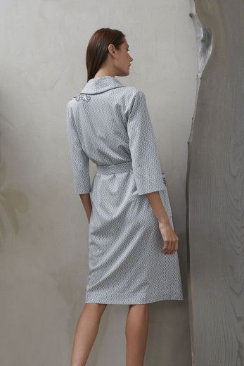 Женский халат длины чуть выше колена. Модель имеет шалевый воротник, окаймленный узким контрастным кантом, красивую вышивку на кармане. Широкий пояс позволяет регулировать посадку и подчеркивает талию. Халат не стесняет движений, позволяет свободно двигаться, а так же чувствовать себя комфортно и расслабленно на протяжении всего дня.
