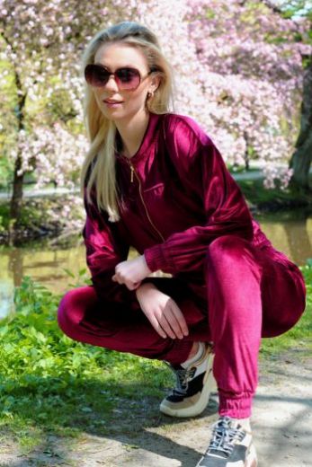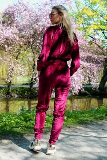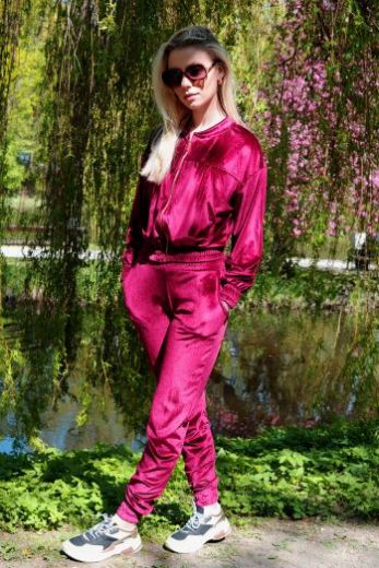 Костюм изготовлен из мягкого эластичного велюра. Материал очень приятный на ощупь. Толстовка застегивается на золотистую блестящую молнию. Рукава и низ толстовки отделаны резинкой. Стильные и супер удобные брюки с резинками. Есть карманы по бокам. Этот комплект для женщин, которые ценят повседневный комфорт и модный стиль.