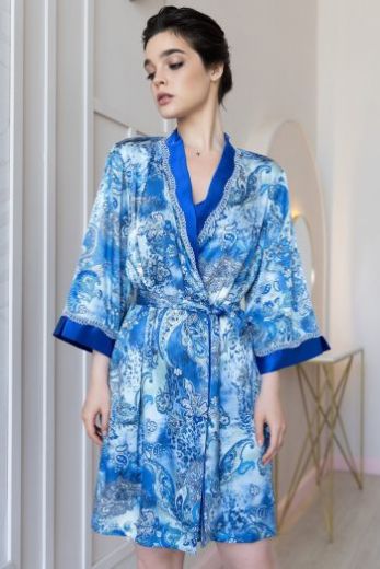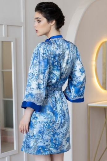 Короткий халат–кимоно Mia-Amore выполнен из принтованной смесовой ткани. Верх бортов и низ рукавов декорированы однотонным атласом и узким кружевом. По бокам расположены карманы.