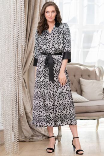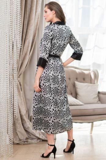 Длинный халат Mia-Amore с центральной застежкой выполнен из принтованного искусственного шелка. Воротник, низ рукавов и пояс выполнены из черного атласа, что подчеркивает элегантную линию коллекции. В боковых швах карманы.