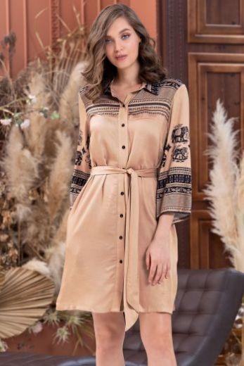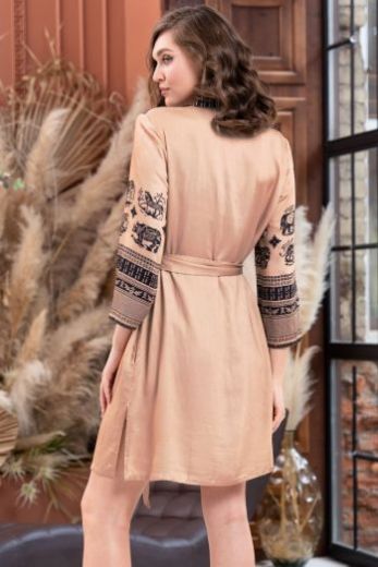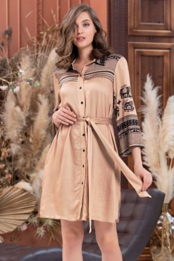 Рубашка Mia-Amore свободного силуэта с рукавом длиной 3/4, выполнена из вискозы c шелком, в боковых швах обработаны карманы. Купонный принт расположен по верхней части полочек и по рукавам. По низу изделия расположены разрезы. Линию талии можно подчеркнуть за счет пояса, который идет в комплекте.