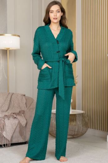 Комплект Mia-Amore состоит из кардигана и брюк. Кардиган свободного силуэта с застежкой на пуговицах, с длинными рукавами, низ которых обработан манжетами. На полочках расположены накладные карманы. Свободные брюки с широким эластичным поясом и кулисой. Линию талии можно подчеркнуть за счет пояса, который идет в комплекте. Комплект выполнен из трикотажного полотна с фактурной вязкой.