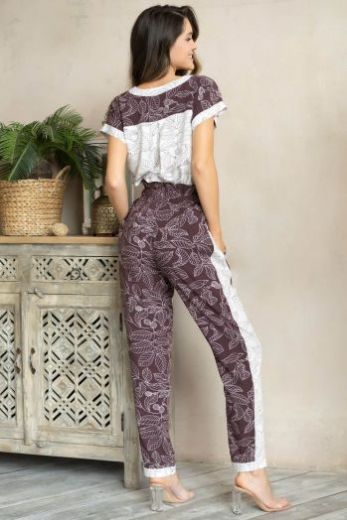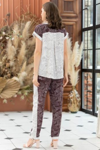 Комплект Mia-Amore состоит из блузки с короткими рукавами и брюк. Комплект выполнен из принтованной вискозы в технике би-колор. Горловина и рукава блузы декорированы светлой обтачкой, на спинке блузки встречная складка. Брюки с высокой посадкой, декоративным бантом на талии и контрастными лампасиками по бокам. Комплект хорошо сочетается вместе и с различными предметами повседневного гардероба.