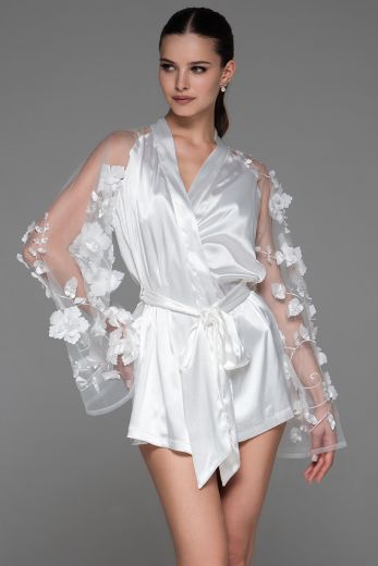Комплект-тройка Mia-Amore выполнен из смесового шёлка в сочетании с эффектной сеткой с цветами. Шорты и бра - из смесового шёлка. Короткий халат выполнен из смесового шёлка, эффектные расширяющиеся к низу рукава выполнены из мягкой сетки с объёмными цветами.