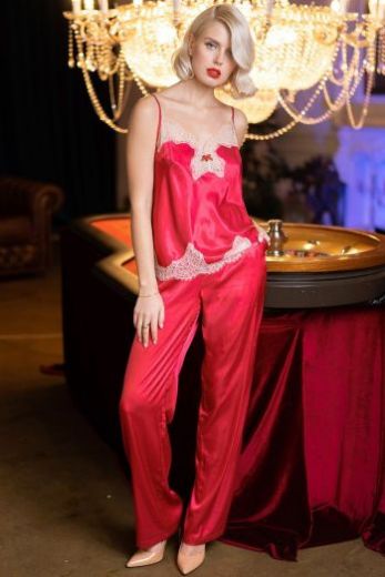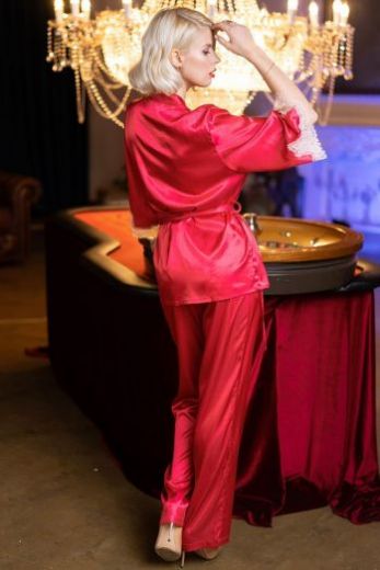 Комплект-тройка Mia-Amore состоит из топа, укороченного кимоно и брюк. Комплект выполнен из искусственного шелка рубинового цвета. Лиф и низ топа, а также рукава кимоно декорированы кружевом. По центру лифа бантик с подвеской. Укороченное кимоно завязывается широким эффектным поясом.