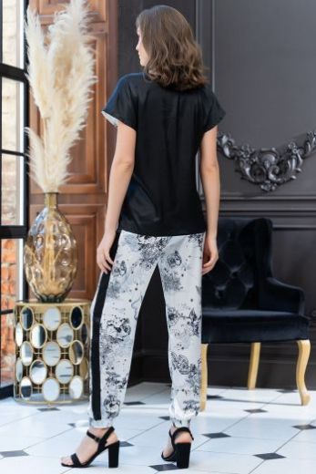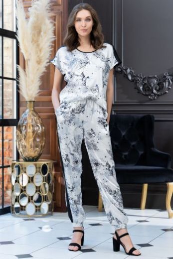Эффектный комплект из брюк и топа Mia-Amore выполнен из искусственного принтованного шелка. Элегантный атласный комплект со спортивными контрастными элементами в отделке выполнен в традициях Sport-chic.