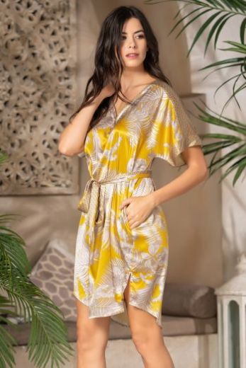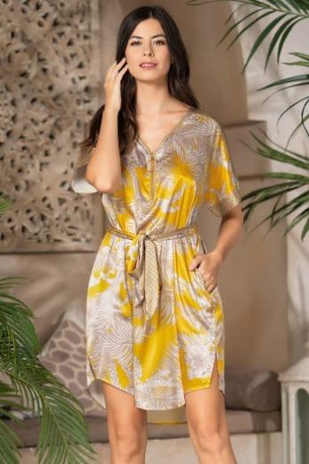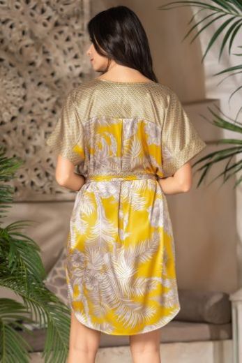 Короткая туника Mia-Amore с короткими рукавами выполнена из лимонного принтованного растительным узором искусственного шелка. Низ рукавов декорирован принтованным мелкоузорчатым геометрическим паттерном. Горловину украшает вырез с эффектной золотой молнией. По бокам туники разрезы и карманы.