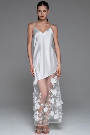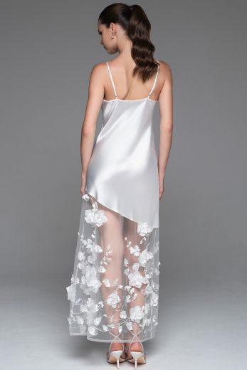 Длинная сорочка Mia-Amore на тонких регулируемых бретелях. Сорочка выполнена из смесового шёлка. Низ сорочки от колен украшен воланом из сетки, которая по низу декорирована объёмными цветами.