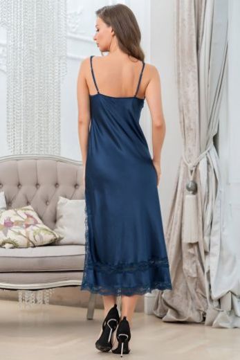 Длинная элегантная сорочка Mia-Amore полуприлегающего силуэта на тонких бретелях, выполнена из однотонного смесового шелка и декорирована узким ажурным кружевом, которое расположено по вырезу, низу и краям разреза сорочки. Центр выреза украшен атласным бантиком с подвеской.