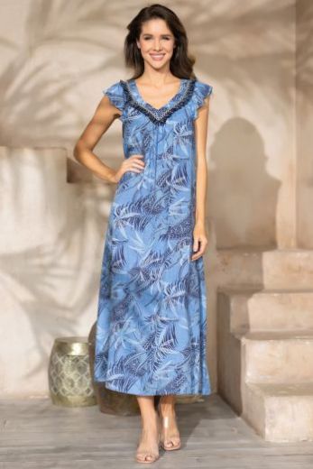 Длинная туника Mia-Amore свободного силуэта с короткими рукавами выполнена из вискозы с цветочным принтом в голубой гамме с этническими мотивами. Горловина туники декорирована бахромой.