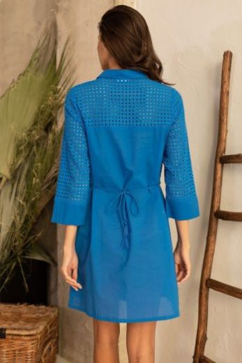 Рубашка Mia-Amore длиной чуть выше колена и рукавом длиной 7/8. Изделие выполнено из гладкого хлопка и дополнено декоративными вставками из вышивного хлопка, которые расположены по верхней части рубашки и рукавам. По бокам обработаны разрезы. Линию талии можно подчеркнуть за счет узкого пояса, части которого вшиты в боковые швы.
