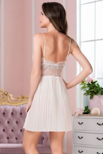 Короткая сорочка на тонких регулируемых бретелях Mia-Amore из атласного полотна выполнена в сочетании с тонким кружевом и шифоном-плиссе. Лиф сорочки с отрезными чашками выполнен из тонкого кружева. Отрезная юбка сорочки – из легкого струящегося плиссированного шифона.