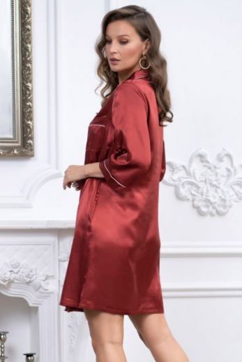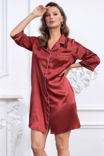 Рубашка Mia-Mella с центральной застежкой на пуговицах с рукавами длиной 3/4, выполненаВ В из искусственного шелкового полотна с атласным блеском. Низ рукавов, борт и воротник обработаны атласными кантами.