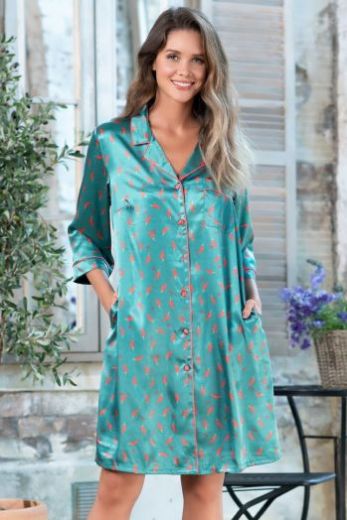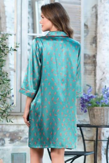 Рубашка Mia-Mella с центральной застежкой на пуговицы с рукавами длиной 3/4, выполнена из принтованного искусственного шелкового полотна с атласным блеском. Низ рукавов, борт и воротник декорированы контрастным кантом.