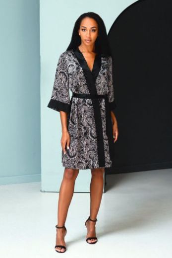 Короткий халат прямого силуэта из натурального 100% шёлка с фантазийным принтом "турецкий огурец" на поясе. Халат с втачными рукавами на манжете. Модель по борту на обтачке, по талии завязывается на внутреннюю завязку.