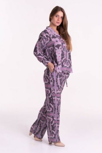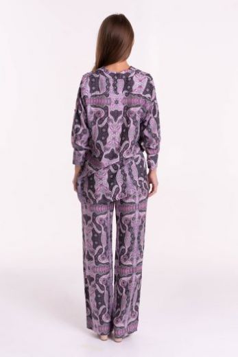Комплект из туники и брюк, из принтованной вискозы. Туника напоминает классическую мужскую рубашку. Отложной воротник со стойкой и застежка планка на пуговицах. Рукав прямой с манжетой на пуговице и с застежкой платой. Заниженная линяя плеча, спущенный рукав, рубашечного кроя. Полочка с вертикальными выточками складками. Спинка удлиненная, с кокеткой и вертикальными выточками складками. Нижний срез туники оформлен полукругом. Брюки, свободного силуэта с карманами. По линии талии на эластичной тесьме и поясе-кулиске.
