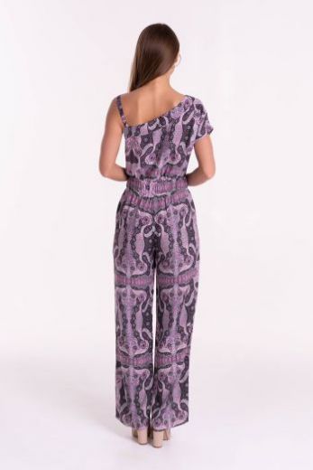 Комбинезон брючный женский, длинный с карманами, из принтованной вискозы. Ассиметричное решение верха, короткий цельнокроеный, спущенный рукав на правое плечо и бретель на левое плечо из основного полотна с регулировкой. Верхняя и нижняя часть соединённые по линии талии. Пояс-кулиска на эластичной тесьме. Крой брюк свободный, прямой.