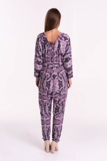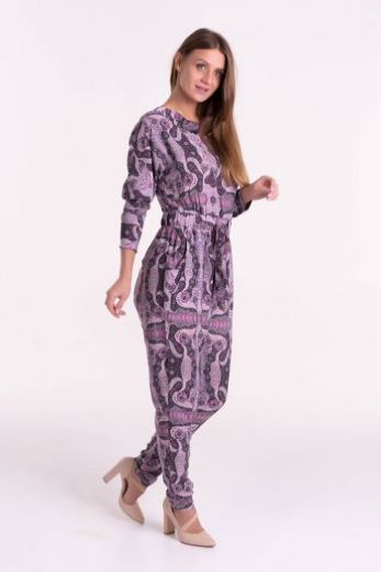 Комбинезон брючный, приталенный с карманами, из принтованой вискозы. Крой рукава летучая мышь, заужены к запястью. Вырез горловины, лодочка, по полочке, на спинке V-образный вырез регулируется с помощью шнура-завязки. Верхняя и нижняя часть соединённые по линии талии. Брюки с заниженным средним швом, свободные. Брючины заужены. Пояс-кулиска на эластичной тесьме.