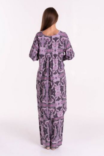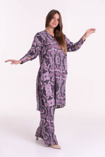 Комплект из удлиненной туники и брюк, выполнен из принтованной вискозы. Туника свободного силуэта. Полочка с застежкой планкой на пуговицах. Спинка оформлена фигурной кокеткой, с вытачками и встречной складкой. Горловина обработана обтачкой. Разрезы в боковых швах. Рукав рубашечный с манжетой на пуговице. Брюки с карманами, свободного силуэта. Пояс на эластичной ленте.