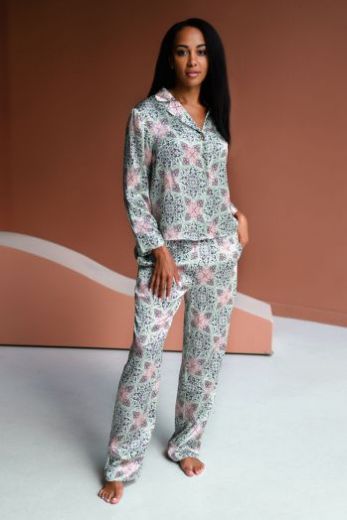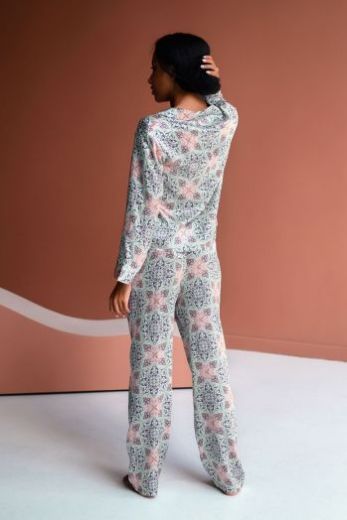 Комплект состоит из жакета и длинных брюк из натурального 100% шёлка с фантазийным принтом. Жакет полуприлегающего покроя с застежкой на пуговицы и отложным воротником. Втачной рукав на манжете. Длинные брюки свободного покроя на эластичной тесьме (резинке) в поясе и с карманами в боковых швах.