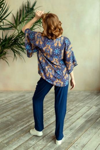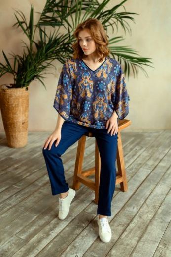 Комплект домашний женский из туники и брюк. Туника свободного силуэта с широкими рукавами длиной 3/4 выполненна из принтованной вискозы. Брюки свободного силуэта на поясе-резинке выполнены из однотонной вискозы.