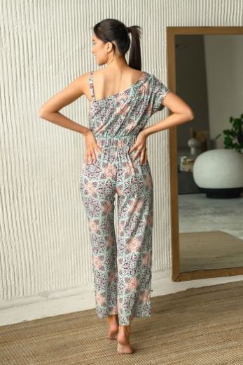 Комбинезон брючный женский, длинный с карманами, из принтованной вискозы. Ассиметричное решение верха, короткий цельнокроеный, спущенный рукав на правое плечо и бретель на левое плечо из основного полотна с регулировкой. Верхняя и нижняя часть соединённые по линии талии. Пояс-кулиска на эластичной тесьме. Крой брюк свободный, прямой