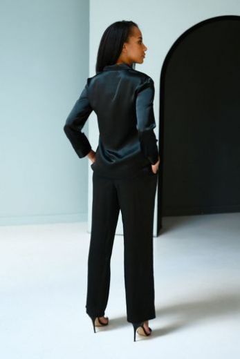 Комплект состоит из жакета и длинных брюк из натурального 100% шёлка. Жакет полуприлегающего покроя с застежкой на пуговицы и отложным воротником, рукав втачной на манжете. Длинные брюки свободного покроя на эластичной тесьме (резинке) в поясе, с карманами в боковых швах.