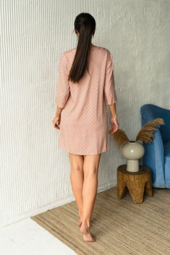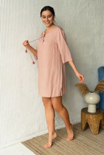Туника средней длины прямого силуэта с круглым вырезом горловины на полочке и спинке из принтованной вискозы. Модель с втачными широкими рукавами и боковыми разрезами. Круглый вырез горловины полочки и спинки обработан притачной фигурной обтачкой. V-образный разрез на горловине полочки обработан притачной планкой. Планка туники декорирована тонким шнурком, который продергивается через люверсы.