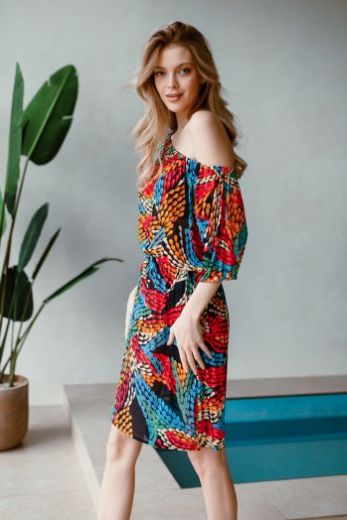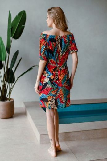 Туника домашняя женская выполнена из эластичной принтованной сетки. Модель приталенного силуэта длиной выше колена. По талии и по плечам изделия кулиска на резинке. Рукав короткий.